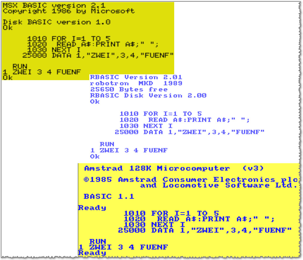 Ein Computerfreund wandte sich unlängst mit einer Frage an mich. In einem Programm sollten auch numerische Daten als Strings eingelesen werden, was nach den BasiCode-Vereinbarungen nicht zugelassen ist, bei READ A$ MUSS an der betreffenden Stelle in den DATAs eine Stringvariable stehen, bei READ A eine numerische. Unter dem Java-Bascoder von Jens Müller wurde dementsprechend auch mit einer Fehlermeldung abgebrochen. Ich testete die Situation als erstes im online-Browser von Rob Hagemans – doch dort funktionierte es, ohne einen Fehler zu melden: