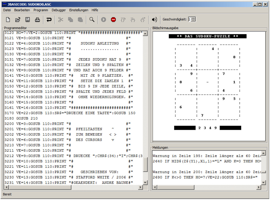 Er ist gut zum Fehlersuchen in Programmen geeignet, wobei (im Unterschied zu Michaels Java-Bascoder) alles in einem Fenster stattfindet. Eine Besonderheit ist, dass der Bildschirm 32 Textzeilen hat – BasiCode geht eigentlich von 24 oder 25 aus. Das entsteht dadurch, dass der Bascoder sich in der Hinsicht an den KC85 anlehnt, welcher über eine Zeichenfläche von 256 x 256 Pixeln verfügt.