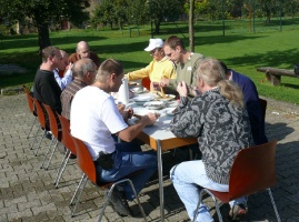Auch die Computerfreunde aßen im Freien. Es gab Nudel- oder Erbsensuppe, dazu Brötchen und gekochte Wiener Würstchen. Das Wetter war nach dem teilweise recht kalten September noch einmal richtig sommerlich geworden.