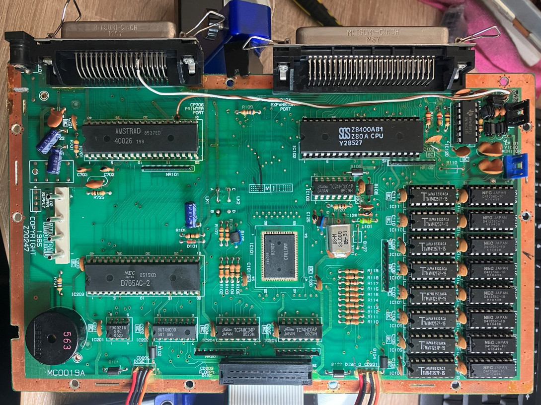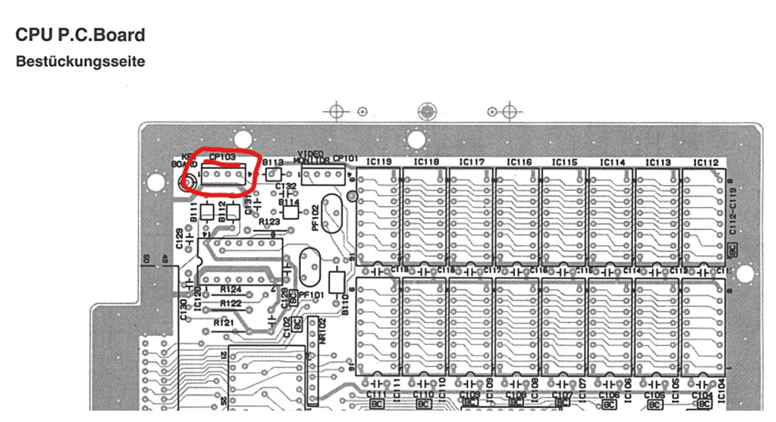 Auch sollte der Rechner um ein 3,5" B-Laufwerk erweitert und der RAM-Speichers auf 512K aufgerüstet werden. Leider hat die Joyce nach dem Booten auf keinen Tastendruck reagiert ! Bei der Eingabe des Datums war erstmal Schluss ! Nach dem ich die Prozessorplatine zugänglich gemacht habe, schaute ich mir an, über welchen Weg die Tastatursignale in den Rechner gelangen. Das Keyboard wird extern über einen 4poligen DIN-Stecker am Gehäuse verbunden. Von dem DIN- Stecker führen vier Drähte zu dem Stecker CP103 auf dem CPU P.C.Board. Eine Messung ergab, dass von der Tastatur Signale bis zu diesem Stecker gesendet, jedoch nicht bis zum CP/M weitergeleitet wurden. Auf der Schaltung erkennt man, dass die Signale vom Keyboard über den Stecker 103, Pin 3 (DATA) zum IC120 Pin 11 führen. Das IC120 ist ein 74HC14 Schmitt Inverter. Eine weitere Messung am Pin 11 ergab weiterhin; die Signale kommen an. Jedoch am Pin 10, dem Ausgang des Schmitt Inverters kam nichts mehr heraus. Der Baustein TC74HC14P beinhaltet 6 Schmitt Inverter, von denen zwei für das Tastatursignal genutzt werden: Pin 11 nach PIN 10 und Pin 9 nach PIN 8. Ab dem Pin 10 war keinerlei Signal zu messen. Somit habe ich einen neuen Baustein besorgt, das defekte IC ausgelötet, einen Sockel verlötet und das neue IC eingesteckt. Auf dem Foto sieht man auch die RAM Erweiterung auf 512K in der oberen Reihe und die korrekt um gelötete Brücke LK1 dazu. Jetzt ist der Rechner wieder voll einsatztauglich und nun auch mit 512K und einem 3,5" Laufwerk B.