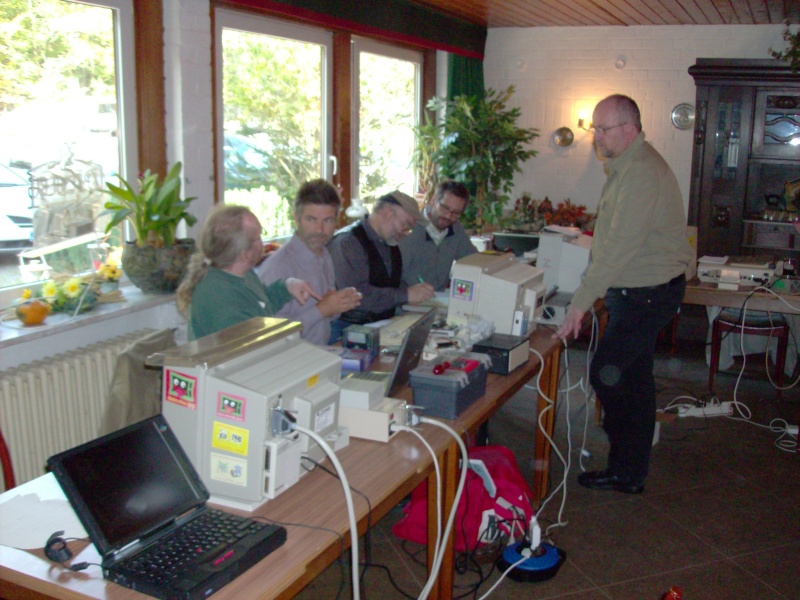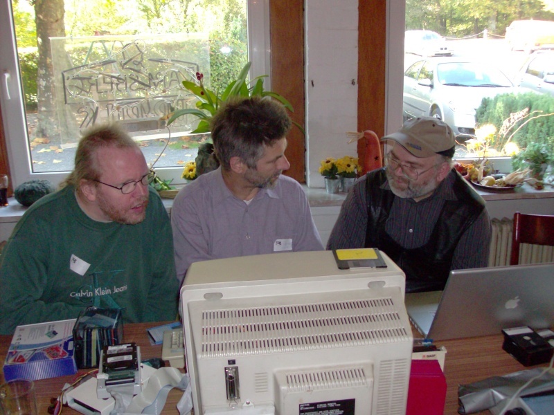 Wieder einmal wurden die alten Rechner aus dem Keller gezerrt, Monitore und Kisten verladen, manche packten ihre Familie mit ein, und los ging’s ins Siebengebirge, wo am 6. Oktober 2007 die beiden Clubs der Joyce-Freunde und der Spectrum- und SAM Anhänger ihr gemeinsames Treffen geplant hatten, und gut 20 Leute, etwa zur Hälfte Joyce- und Spectrumfreunde, hatten sich in der Margarethenhöhe bei Ittenbach eingefunden. Mein Bericht beginnt am Samstagmorgen in Edertal beim Dirk Berghöfer, wir hatten einen sehr großen Monopoly Spieltisch für Bernhard Lutz (Luzie) mit dabei. Neben dem passte nicht mehr ganz so viel ins Auto, so dass wir außer unsren Sams nur wenig weitere Computerteile mitgenommen hatten. Nach der gut 2-stündigen Fahrt kamen Dirk und ich gut in Ittenbach an, und brachten erstmal unsere Geräte in den Raum. Bald darauf war das vertraute Surren von Festplatten, Lüftern und Sperrschwingern zu hören, manches WAVE wurde abgespielt, Johan Koelman hackte einen seiner Einzeiler BASIC Programme in den Spectrum ein, die Joyce-Laufwerke kamen wieder zum Leben. Ich holte mir Kaffee und schaute mir die Computer an. Die Joycer machten am Samstagmorgen noch ihr jährliches Mitgliedertreffen, bei dem beschlossen wurde, dass es im nächsten Jahr in Ittenbach kein Usertreffen geben wird. Wir werden versuchen, ein gemeinsames Joyce - SPC Treffen in Kassel oder Wolfhagen zu etablieren.