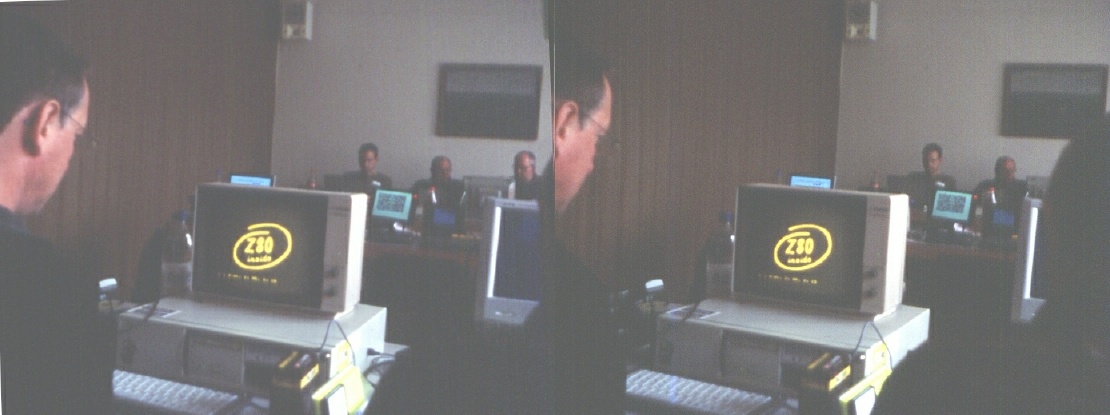 Dann kehrten die Computerversessenen an ihre Tastaturen zurück (hätten sie bei schlechtem Wetter schließlich auch gemacht). Ich hatte mir eigentlich vorgenommen, mein Diashow-Programm (auf der Basis der Streamlined Basic-Lösung von Geoffrey Childs) zu verfeinern und veröffentlichungsreif zu machen, aber kam damit nicht sehr viel weiter. Werner und Jörg Sch. hatten ein wenig mit dem grafischen Betriebssystem SymbOS experimentiert und bei beiden traten auf den Original-JOYCEs die gleichen Fehlfunktionen auf. Nun wollten sie wissen, ob ich auf dem emulierten JOYCE die gleichen Erfahrungen gemacht habe. Das konnte ich verneinen, also versuchte Werner, ob es sich ändert, wenn er eine Diskette verwendet, die ich ihm am PC von dem von mir verwendeten DSK-File bespielt habe. Es blieb dabei und wir kamen einmütig zu der Einschätzung, daß die JOYCE-Version dieses 8-bit-Betriebssystems wohl an einem Emulator erstellt und getestet worden ist.