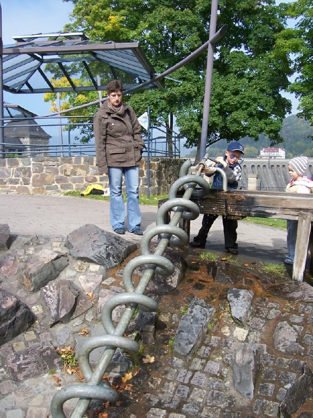 Die Frauen (von Lothar, Werner und Bernhard sowie meine) und Linus unternahmen inzwischen einen kleinen Ausflug. Vom Edersee war Wasser abgelassen worden, dadurch hatte er jetzt eine Insel. Für eine Dampferfahrt war nicht genug Zeit, aber über die Staumauer machten sie einen Spaziergang und dann konnte Linus auf dem großen Wasserspielplatz verschiedene Spiele ausprobieren. Danach fuhren sie zum Schloß Waldeck und liefen erst einmal den Rundwanderweg um die Burg ab und fuhren anschließend mit der Seilbahn auf die Burg. Von dort oben konnten sie noch einmal den Stausee und die Staumauer sehen. Schließlich gab es noch ein Picknick im Freien.