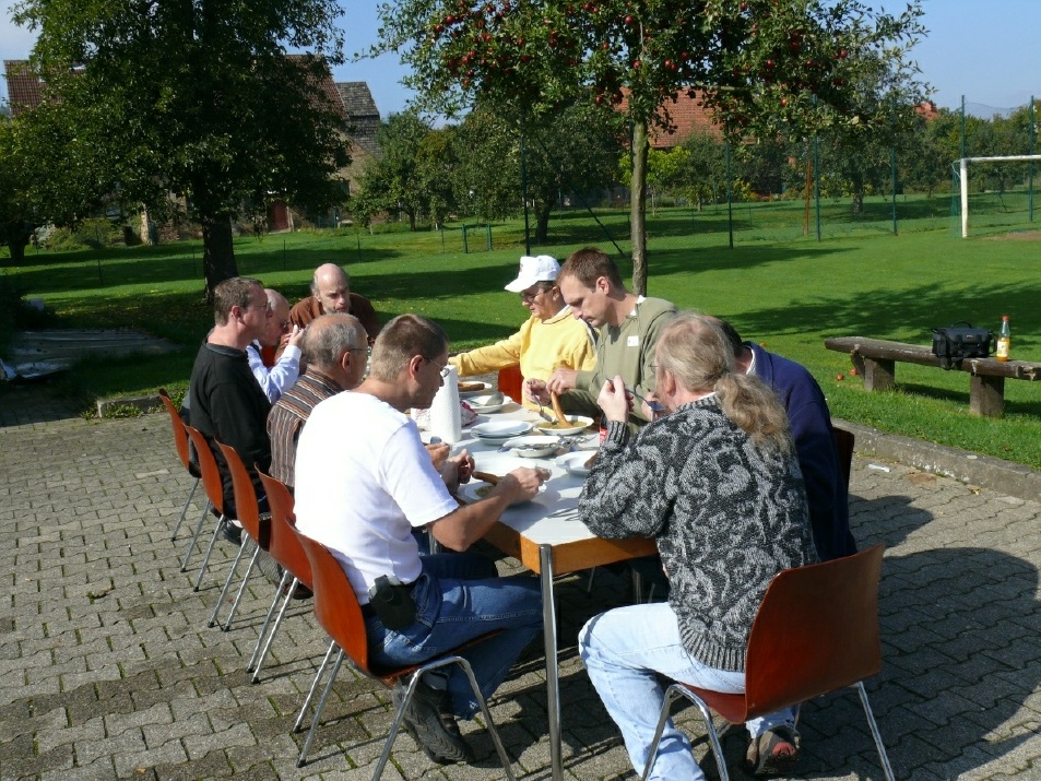 Auch die Computerfreunde aßen im Freien. Es gab Nudel- oder Erbsensuppe, dazu Brötchen und gekochte Wiener Würstchen. Das Wetter war nach dem teilweise recht kalten September noch einmal richtig sommerlich geworden.