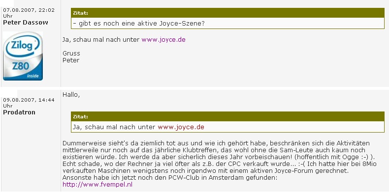 Werner hatte auch schon Anfragen an den Programmierer geschickt, die unbeantwortet blieben. Das hat allerdings einen merkwürdigen Beigeschmack, hatte dieser doch gemeint, in einem Internetforum seine Einschätzung verbreiten zu müssen, beim JOYCE-Klub sei außer den Klubtreffen wohl nicht mehr viel Aktivität vorhanden. Jedenfalls wäre es kein Problem, ihm einen echten JOYCE (und sogar dauerhaft) zur Verfügung zu stellen, sowohl Werner als auch Lothar haben genügend davon in Reserve stehen.